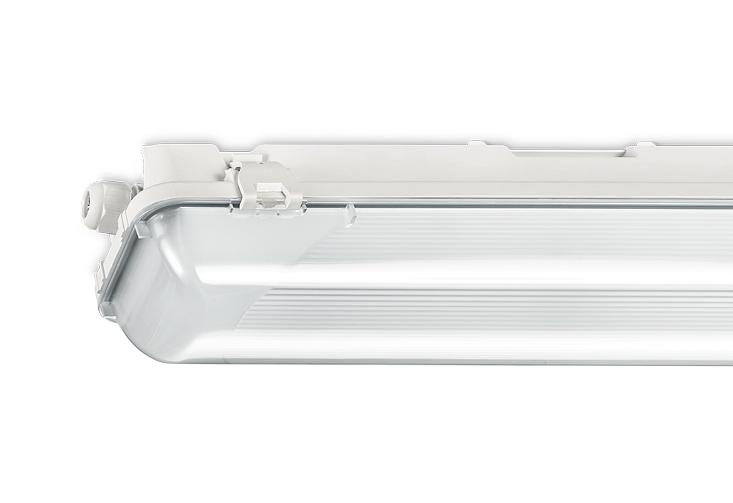 Waterdicht armatuur die buiten geplaatst mag worden, mits het onder een dichte overkapping gemonteerd wordt. Inclusief wartel en set plafondbeugels voor klikmontage. Gemaakt van polyester, versterkt met glasvezelmat. Reflector van wit gemoffeld plaatstaal. Inclusief geïntegreerde led, standaard in 4000K.